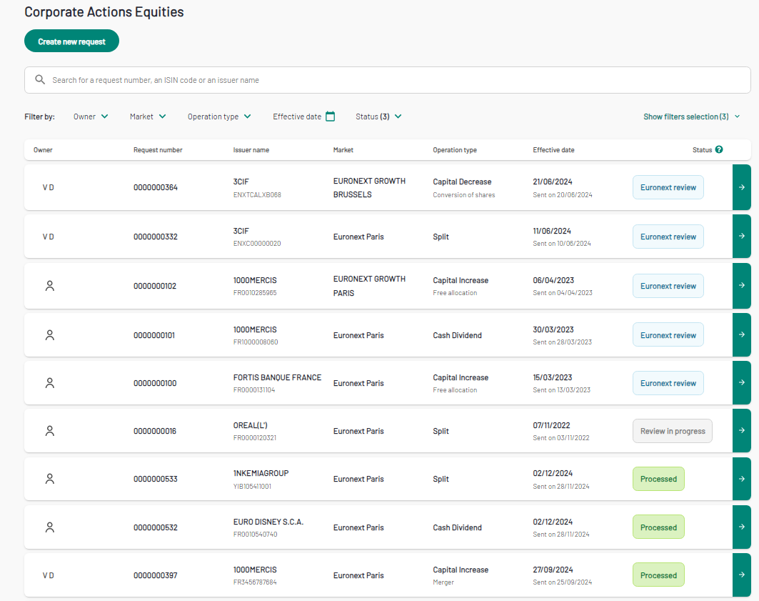 - Processed : Request is processed by Euronext, the notice is available is PDF format