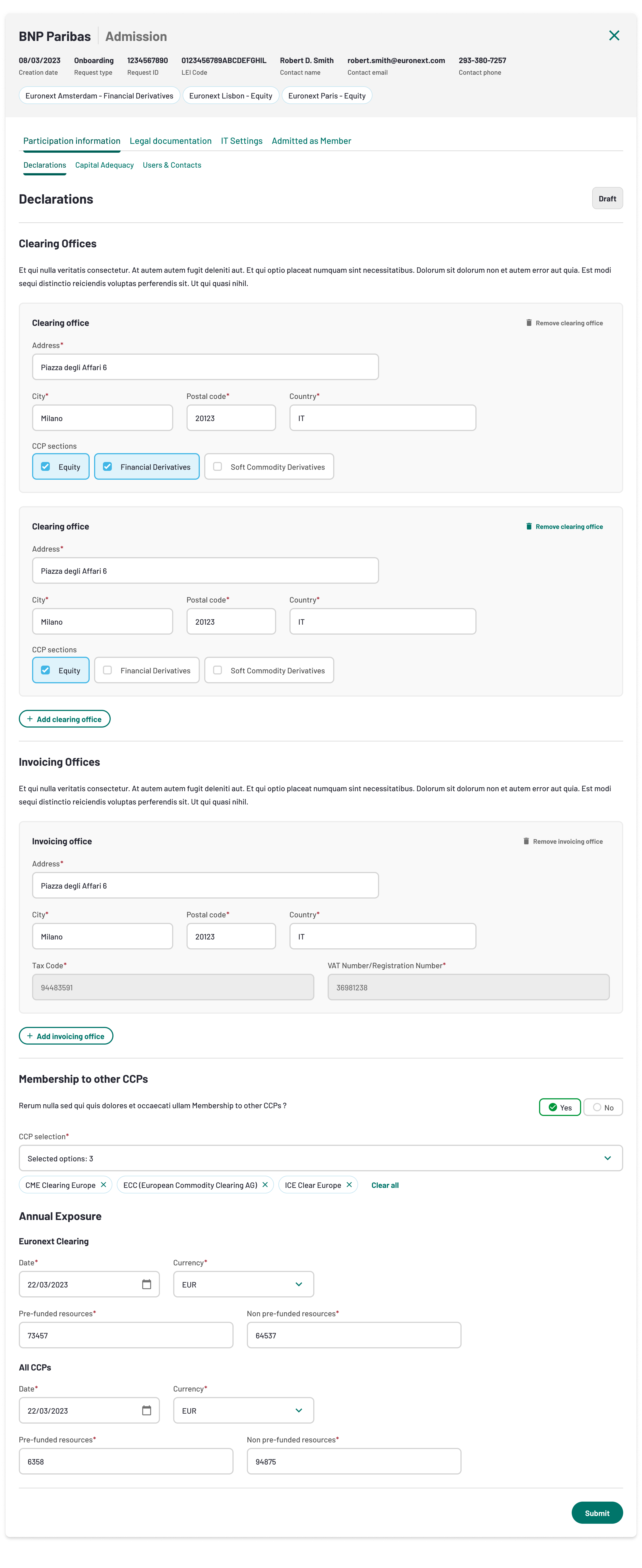 - Clearing Offices : Address at which the clearing activities are managed. It could be the same as the registered office and it could be different per Asset Class and CCP section.