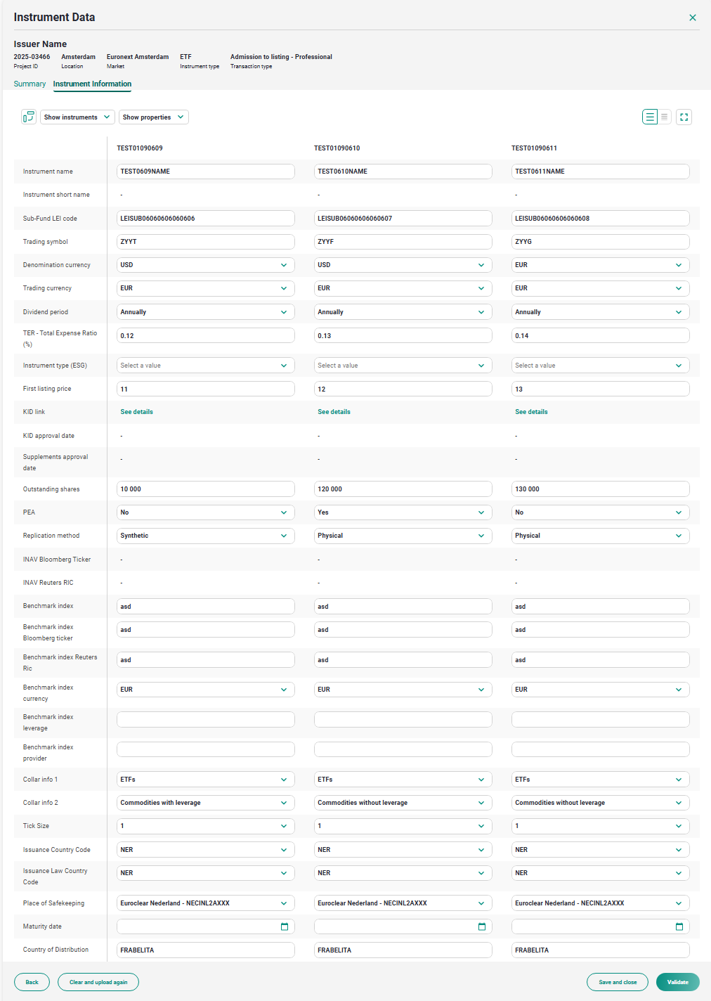 The data is then automatically converted to a table (see example below), which you can either save as a draft or validate. Euronext will receive a notification and will review the form.