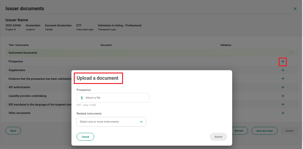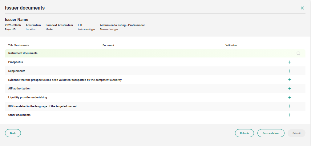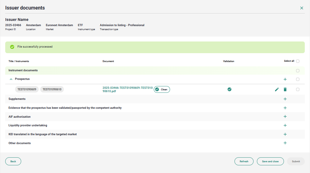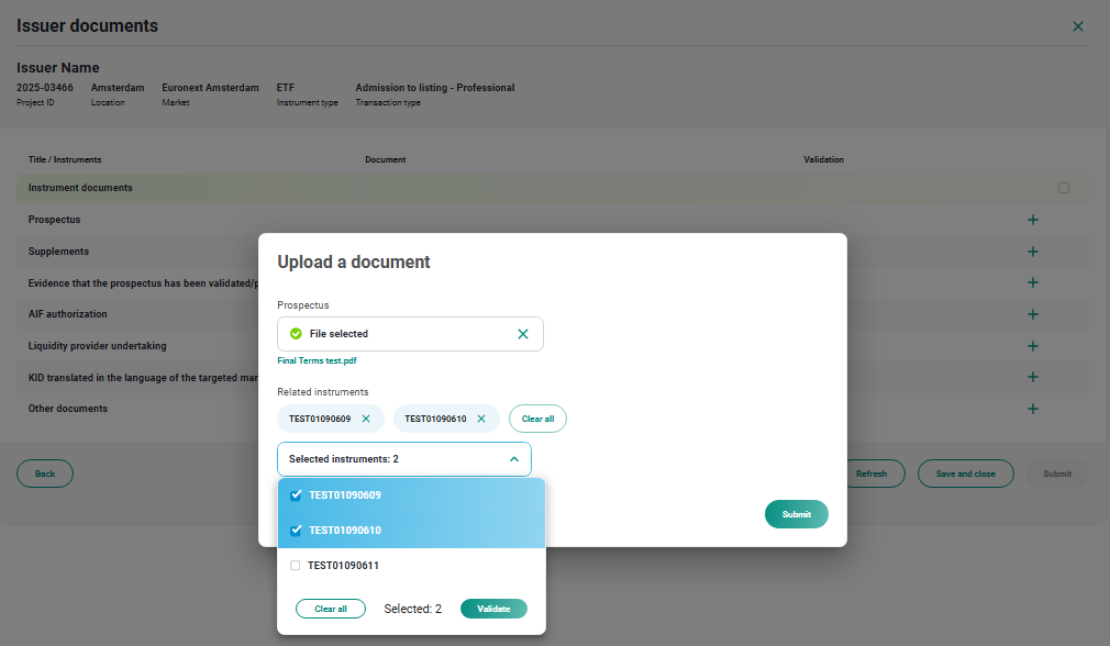 When the antivirus scan is finished, select all the documents you have uploaded flagging them one by one or using the "Select all" flag. The Submit button will be enabled, click on it to submit to Euronext for validation.
