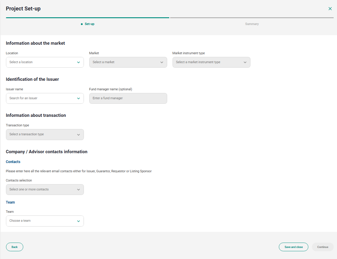 Choose the Location, Market, Instrument type, Issuer name and Transaction type, then enter the relevant contacts for the project.