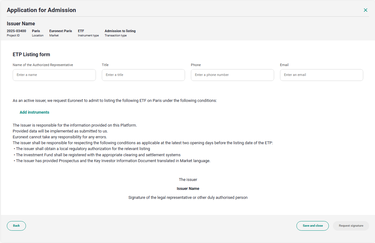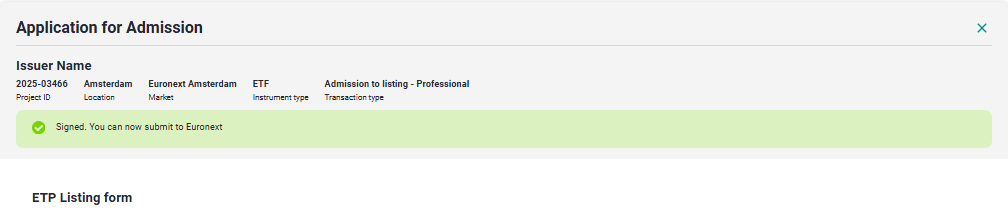 Once the application has been signed, submit the application for admission clicking on Submit to Euronext.