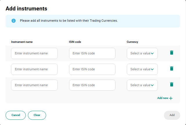 Clicking on "Add Instruments" you will be able to add all the ISINs in the listing project perimeter, with the linked Instrument Name and Currency.