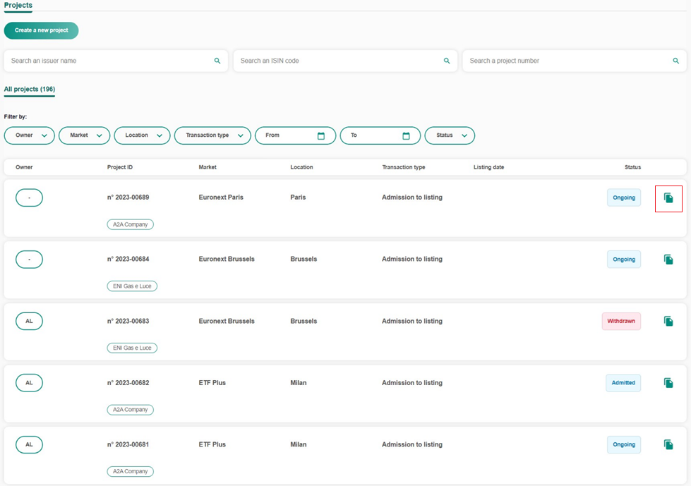 You will be able to copy a project form an already existing one, by clicking on the dedicated icon available on the List of Project page, near any project.