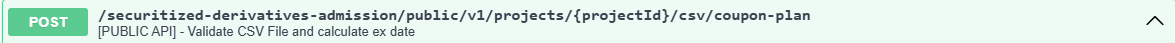 The POST /securitized-derivatives-admission/public/v1/projects/{projectId}/csv/coupon-plan API lets you validate CSV and calculate the ex-date.