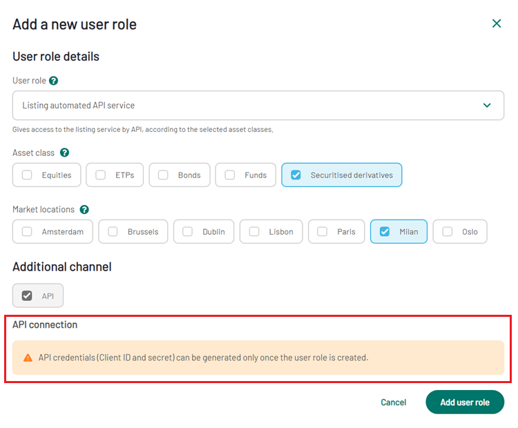 The Listing of Securitised Derivatives API service is designed to enable machine to machine listings without the need to enter the MyEuronext platform by a physical user account.