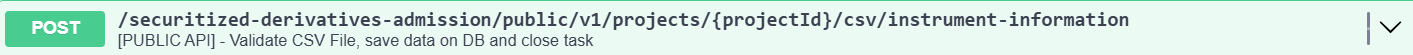 The POST /securitized-derivatives-admission/public/v1/projects/{projectId}/csv/instrument-information API lets you validate CSV, save instrument information data and close the task (send to Euronext) if Action is Complete.