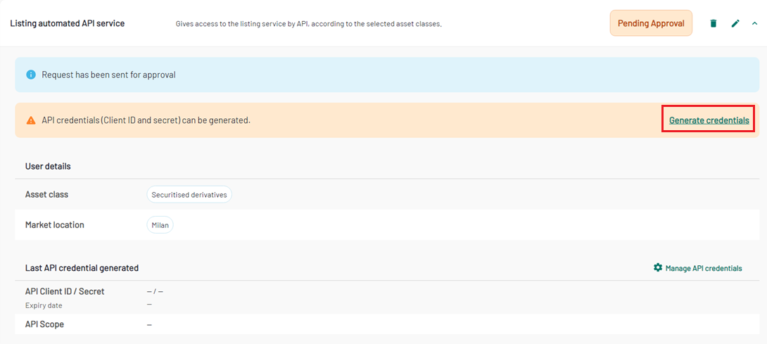 The API credentials (client ID, client secret and client secret expiry date) can be generated through MyEuronext Company Settings (In the first version of this service, the credentials will be generated by Euronext and communicated to the client via email).