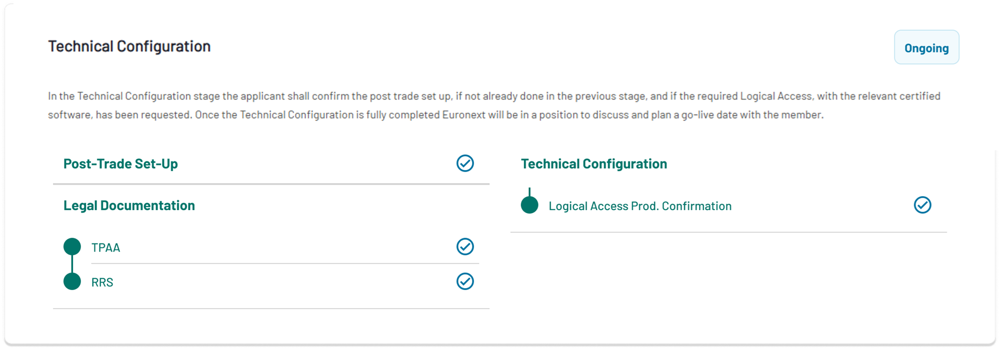 Once the Admission phase is completed, the Technical Configuration stage starts, the status moves to Ongoing and the folder for this phase is displayed as follows: